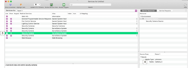 Expand the disclosure triangles to locate the relevant Security Camera service.
