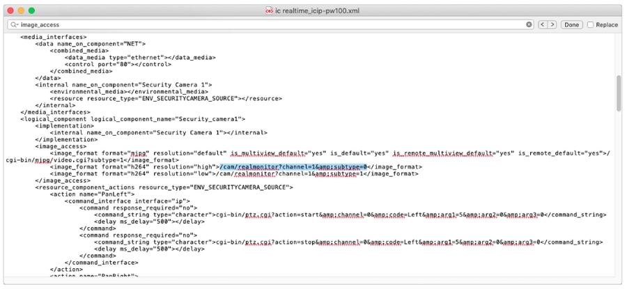 Open the Component Profile for the camera or surveillance system using any text-based XML reader (Oxygen, SublimeText, Atom), or simply TextEdit:
